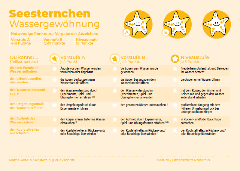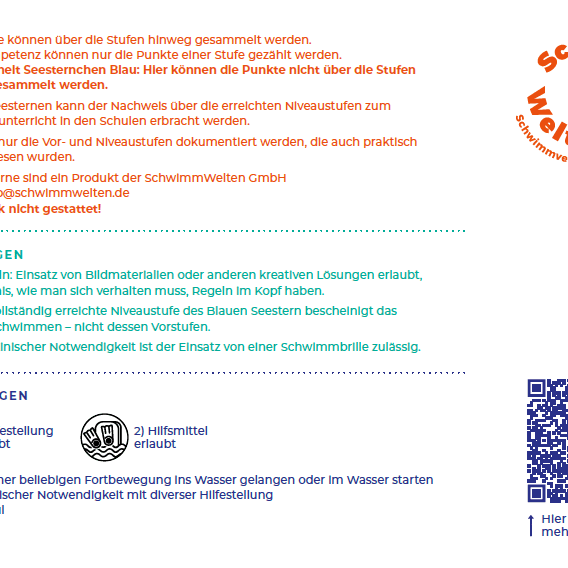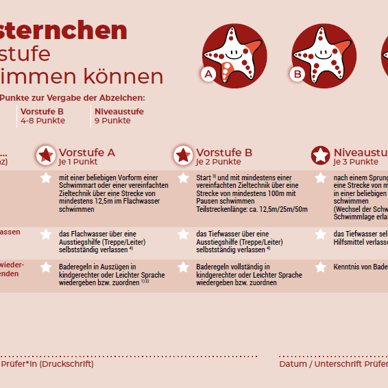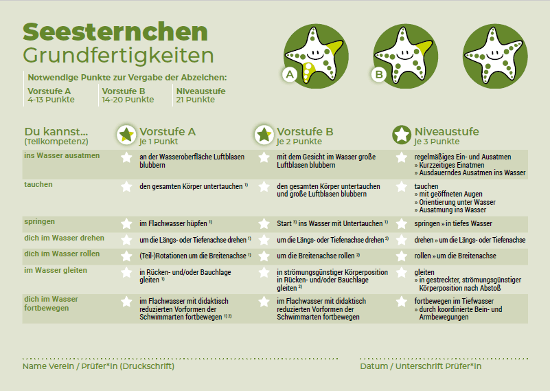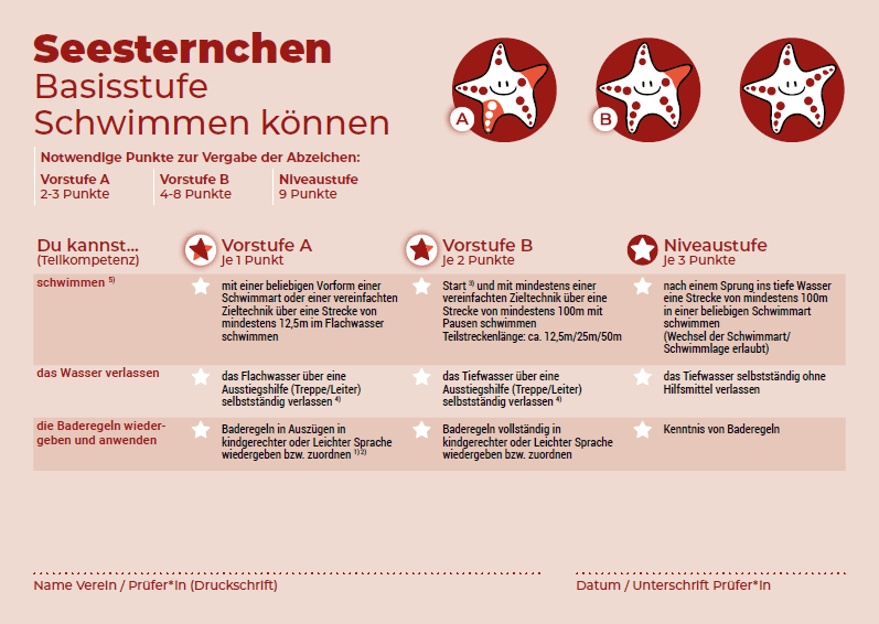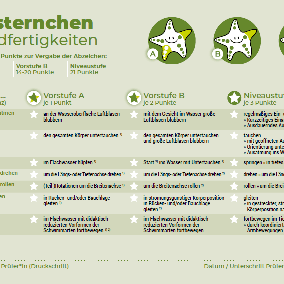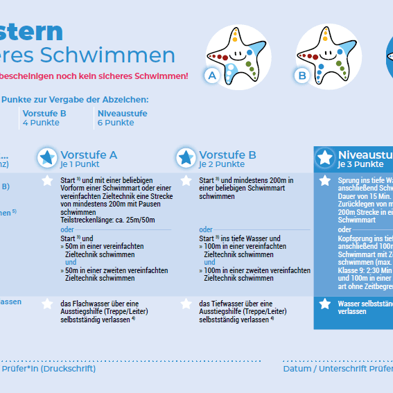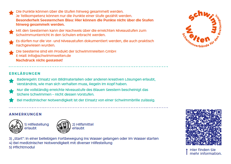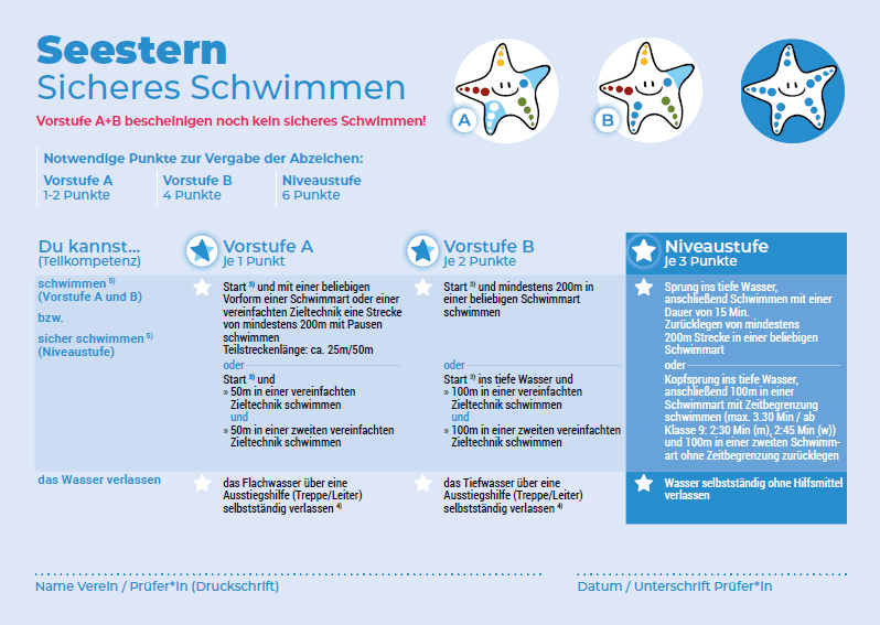 Wichtig: Nur die vollständig erreichte Niveaustufe des blauen Seesternchens bescheinigt das Sichere Schwimmen – nicht dessen Vorstufen. Bei medizinischer Notwendigkeit ist der Einsatz einer Schwimmbrille zulässig.