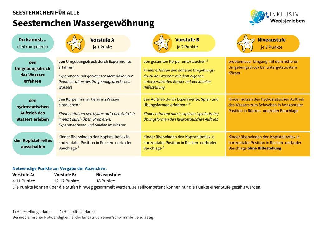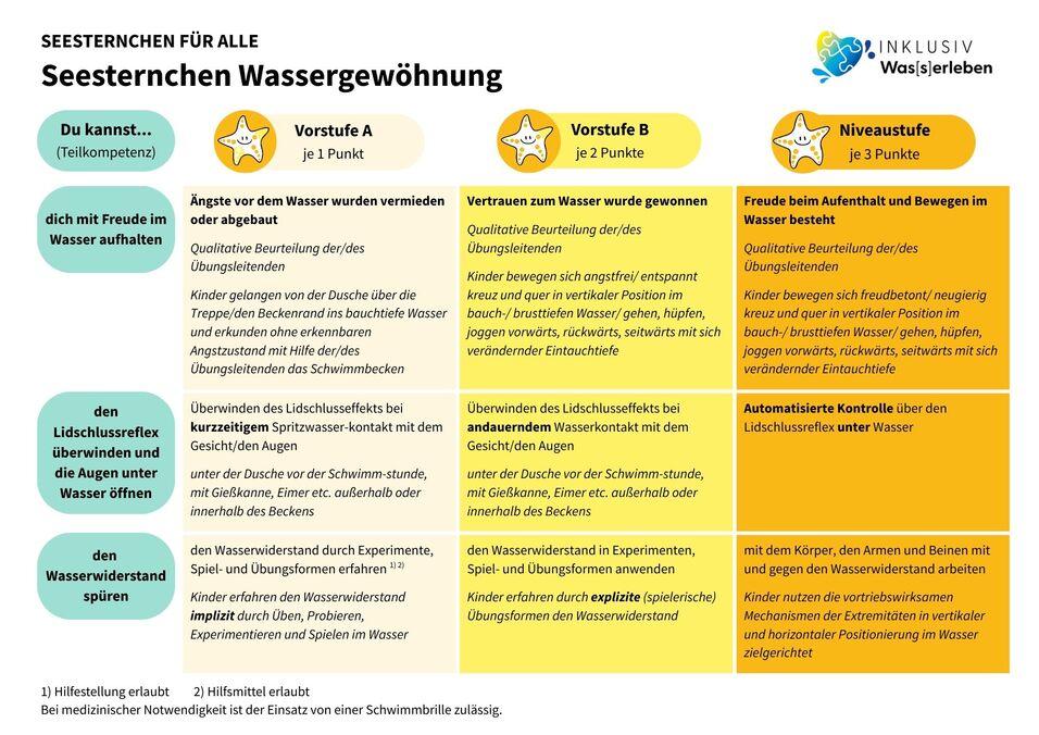 Das gelbe Seesternchen deckt das Thema „Wassergewöhnung“ ab. Sich mit Freude im Wasser aufzuhalten, ist elementar. Schritt für Schritt wird mit und ohne Hilfsmittel oder personeller Unterstützung erarbeitet, wie man sich im Wasser bewegen, gehen und gleiten kann. Wasser hat verschiedene Eigenschaften und wirkt besonders auf den Körper ein. Es geht darum, diese wahrzunehmen und sich darauf einlassen zu können.
